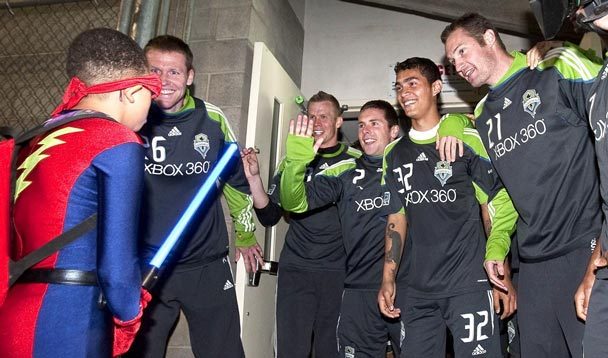At Qwest Field, Electron Boy was directed by frantic fans to the Sounders locker room, where the entire team was shouting for help behind jammed doors. With a little help from “Lightning Lad,” the alter ego of local actor Rob Burgess, Erik opened the door with his lightning rod. The Sounders cheered. “Thank you, Electron Boy!” said defender Taylor Graham. “You saved us!” exclaimed forward Nate Jaqua. “Good job, big man,” said defender Tyrone Marshall. Forward Steve Zakuani, mutely bowed his thanks.