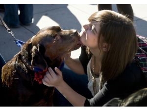 Students signed waivers and stood in line for a chance to spend several minutes with their choice of eight different dogs, including a Labrador, a French bulldog and a Shetland sheepdog. “Animals help relieve anxiety,” said Megan Kauffman, a therapist with the university’s Student Psychological Counseling Services. “It’s really therapeutic to pet a dog and relax, especially during finals.” Freshman Eddie Lopez said the sight of a dog was welcome. “Since we can’t have dogs in the dorms, it’s been forever since I’ve seen a dog,” Lopez said. “It’s fun to be able to pet one.”