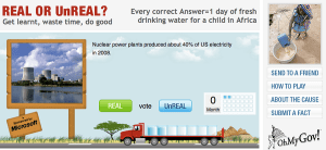 A new and addictive trivia game from the Webby-honored government blog OhMyGov.com gives people the power to save lives. The “Real or UnReal” game (http://ohmygov.com/pages/realunreal.aspx) presents factoids taken from breaking news, political history, science and technology, and the strange-but-true stories of government that OhMyGov is known for, and asks readers to cast their vote: Are they Real or UnReal? For every correct guess, OhMyGov donates funds to its charity partner, Blood:Water Mission, to provide one day’s worth of safe drinking water for a child in Africa.