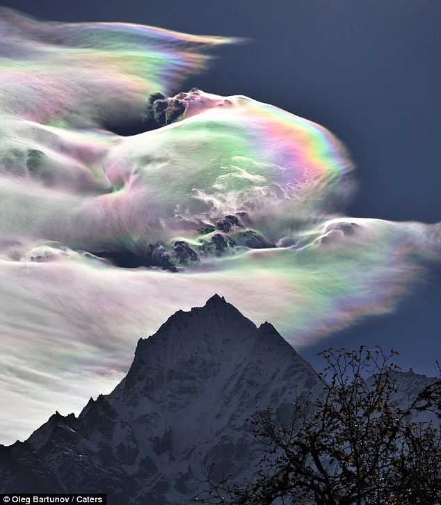 Hovering in the sky, a rainbow cloud over Mount Everest took an astonished astronomer by surprise. Oleg Bartunov, a fellow at the Sternberg Astronomical Institute in Moscow, caught the spectacle on camera during a Himalayas expedition in Nepal. His two images show almost the whole spectrum of the rainbow in a natural event rarely recorded at Mount Everest.