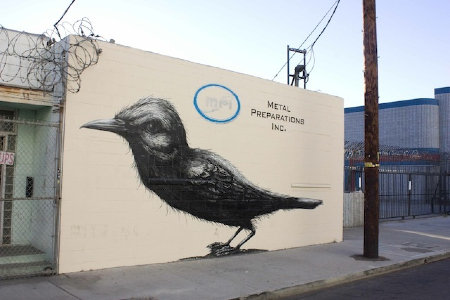 Despite its successful reception downtown and rising interest in street art, increased calls for police to crack down on L.A.’s graffiti have some opposed to Freewalls’s work. But Lahoda says he sees the art really making a positive impact. For example? After ROA came into town and painted on Metal Preparations Inc.’s walls, the owner was so pleased with the extra attention his building got from locals and tourists that he decided to spiff up the space around the mural with a fresh coat of paint, specifically asking contractors to carefully navigate around every feather on ROA’s avian artwork. Responses like these are what keep Lahoda committed to his project. “Street art like this transforms a community not just physically, but psychologically as well,” he says. “It changes how people interact with each other and their environment.”