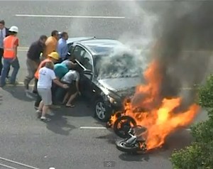 Johnson initially tried to lift the 2-ton car on his own, but even after five others joined him, they were unable to do it. But a split-second after the mystery woman determined Wright was still alive, others arrived to pitch in. All told, about a dozen people put their muscle into lifting the car on its right side, enabling a construction worker to drag Wright out from under. All the while, the citizen rescuers were not only dealing with flames blazing out from the car, but also from Wright’s motorcycle, which was nearly engulfed in fire.