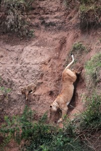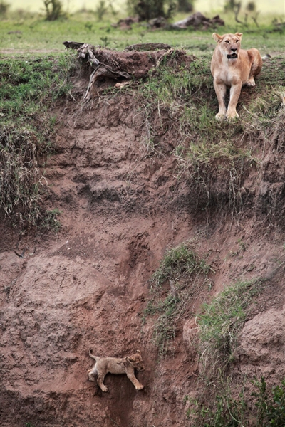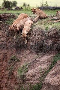 Other members of the pride attempt to rescue the cub but stop trying when they realize it is too steep.