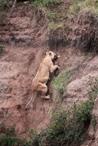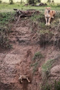 A lioness looks around helplessly after her cub fell down a ravine and couldn’t make it back up the cliff.