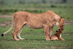 Safe and sound, the lioness gives the cub a big welcome-back lick.