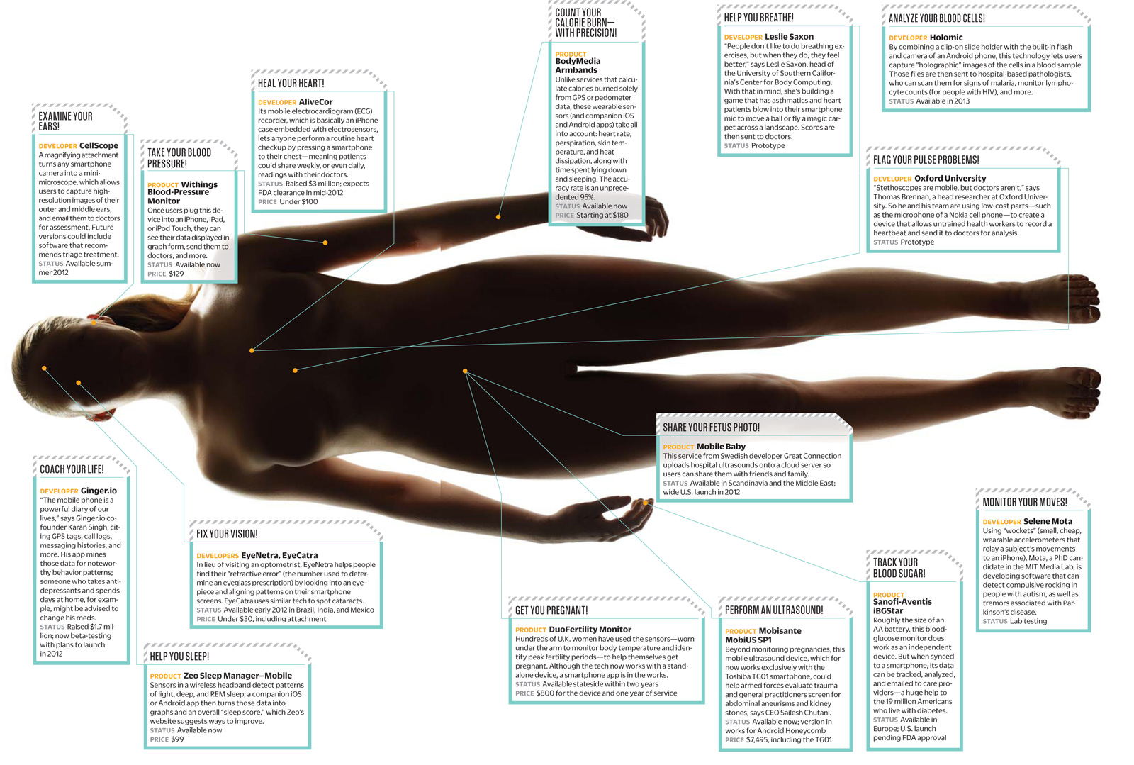 This is the thrilling, disruptive potential of “mHealth,” the rapidly growing business of using mobile technology in health care. Leveraging the wonders of a device that’s fast becoming ubiquitous–two in three people worldwide own a cell phone–a new generation of startups is building apps and add-ons that make your handheld work like high-end medical equipment. Except it’s cheaper, sleeker, and a lot more versatile. Smartphones can already track calories burned and miles run, and measure sleep patterns. By 2013, they’ll be detecting erratic heartbeats, monitoring tremors from Parkinson’s disease, and even alerting you when it’s prime time to make a baby.