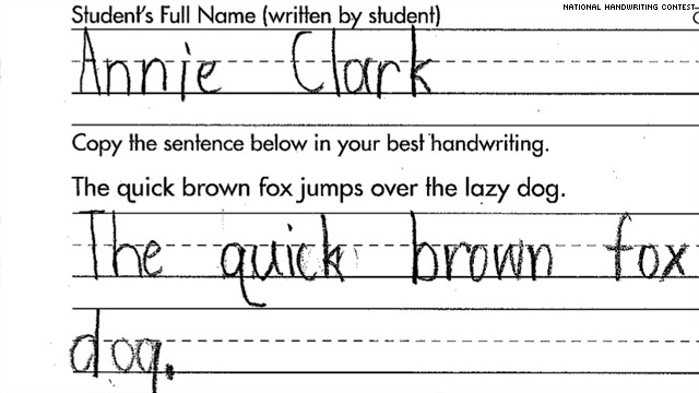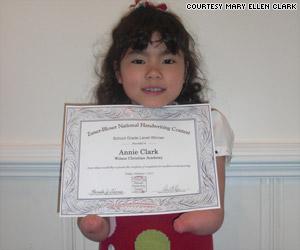 Talk about beating the odds: A first-grader born without hands who was adopted by a Pittsburgh familyhas won a national penmanship award. Seven-year-old Annie Clark was honored with the Nicholas Maxim Special Award for Excellent Penmanship at a surprise school assembly last week. Her mom says Annie was shocked to be presented with a trophy and $1,000 prize from Zaner-Bloser, the publishing company that sponsors the contest. “I could tell she was overwhelmed, but she was poised,” said Mary Ellen Clark.