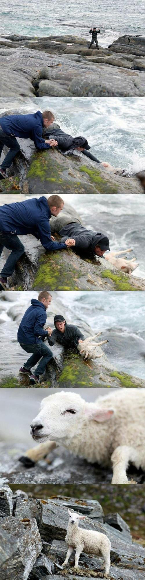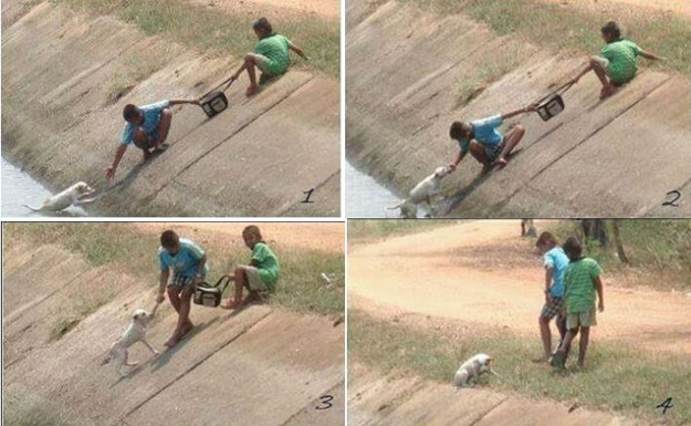 Two children collaborating to rescue a dog who had fallen into a ravine.