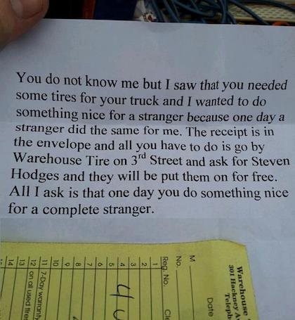 Last week a photograph was posted to a social media website showing a typed note left anonymously on a truck. The Good Samaritan wrote, “You do not know me but I saw that you needed some tires for your truck and I wanted to do something nice for a stranger because one day a stranger did something nice for me. The receipt is in the envelope and all you have to do is go by Warehouse Tire on 3rd Street and ask for Steven Hodges and they will be put on for free.” The note ended: “All I ask is that one day you do something nice for a complete stranger.”
